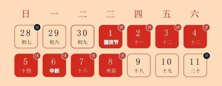 2025年10月1日(周三)-8日(周三)放假调休!